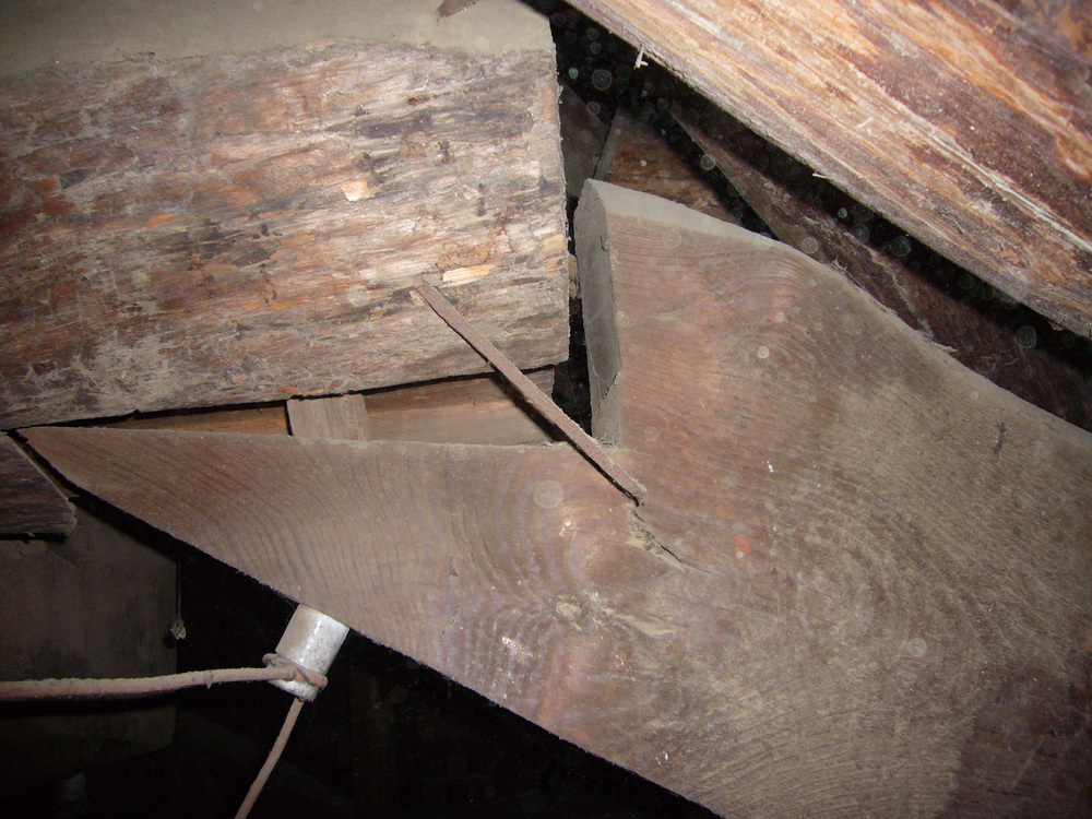 平成26年1月より2月末まで全体調査工事に着手。正面向拝と側面の妻足場を架けて軒廻りと妻壁、破風、屋根瓦等の調査。斗組、壁板、濡れ縁、床下の柱脚部分等の腐朽状態の調査、それから床の不陸、柱の傾斜の有無を実施しました。調査の結果、気がかりであった屋根を支える小屋組内部は、部材が細く、部材同士がしっかり組み合わさっていない危険な状態であることが判明しました。さらに、耐震性確保に重要な外壁はその機能を失い、建物を支える基礎周りも老朽化が進行していました。