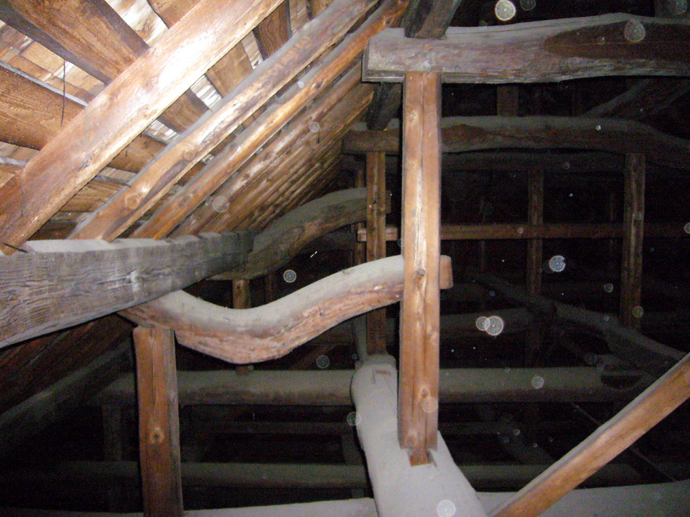 平成26年1月より2月末まで全体調査工事に着手。正面向拝と側面の妻足場を架けて軒廻りと妻壁、破風、屋根瓦等の調査。斗組、壁板、濡れ縁、床下の柱脚部分等の腐朽状態の調査、それから床の不陸、柱の傾斜の有無を実施しました。調査の結果、気がかりであった屋根を支える小屋組内部は、部材が細く、部材同士がしっかり組み合わさっていない危険な状態であることが判明しました。さらに、耐震性確保に重要な外壁はその機能を失い、建物を支える基礎周りも老朽化が進行していました。