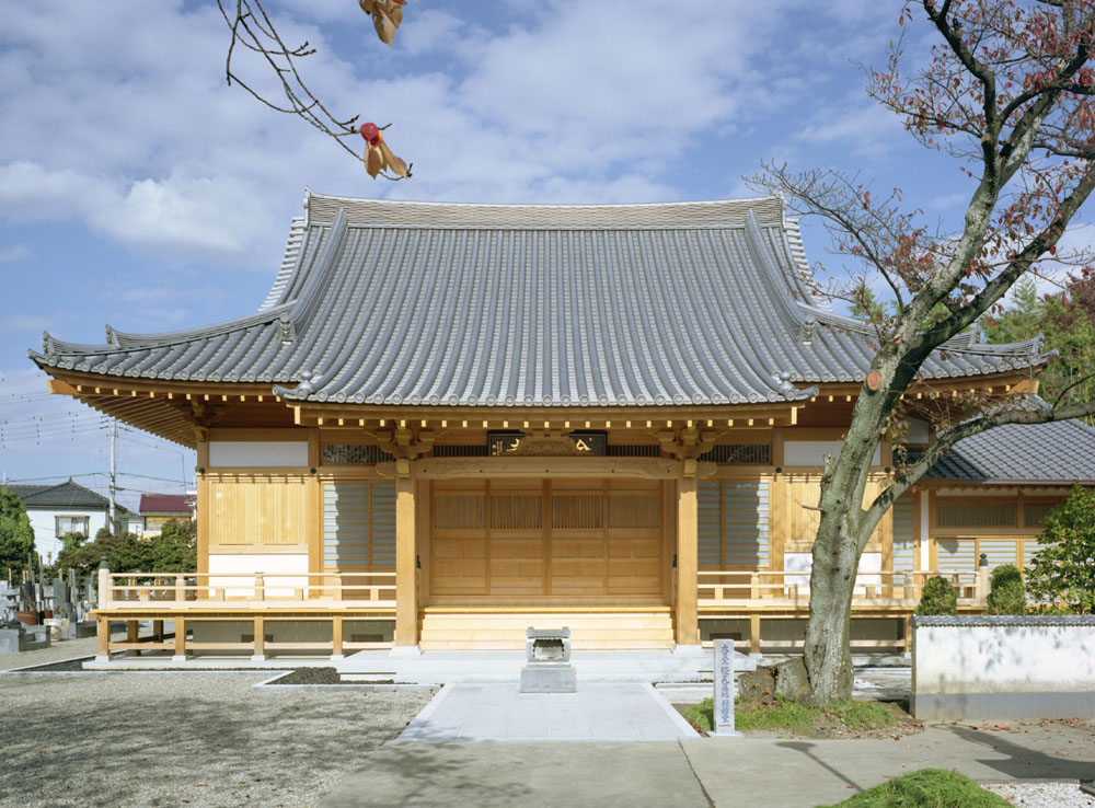 間口7間奥行6間半の入母屋流れ向拝造り一体瓦本葺きの本堂です。工事費の坪単価が200万円を割る予算でしたが、品質を落とすことなく満足できる作品に完成できたことは協力会社の方々に感謝です。