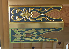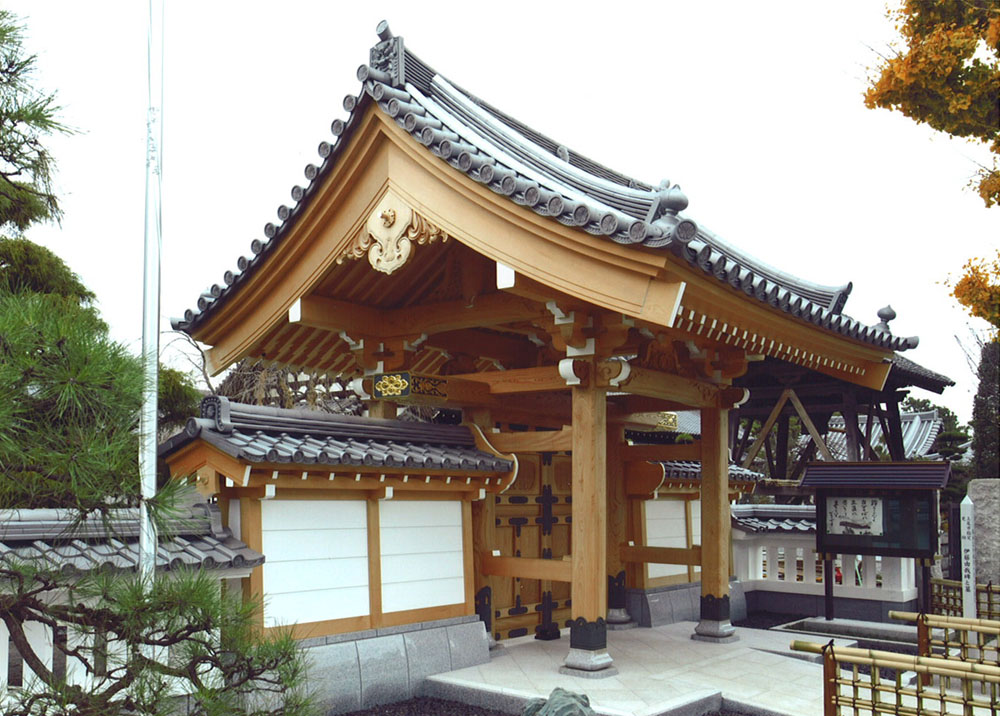 間口8尺の四脚門で桁下が欅材、上がカナダ檜材で桟唐戸の八双金具、根巻金物と重厚感のある荘厳な山門になりました。