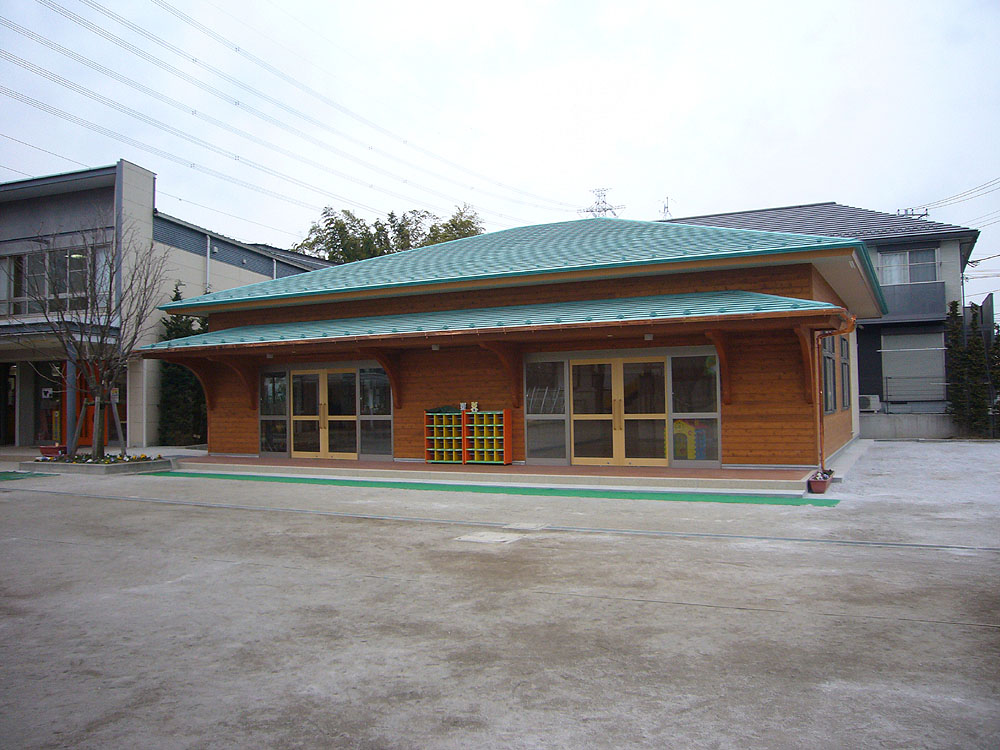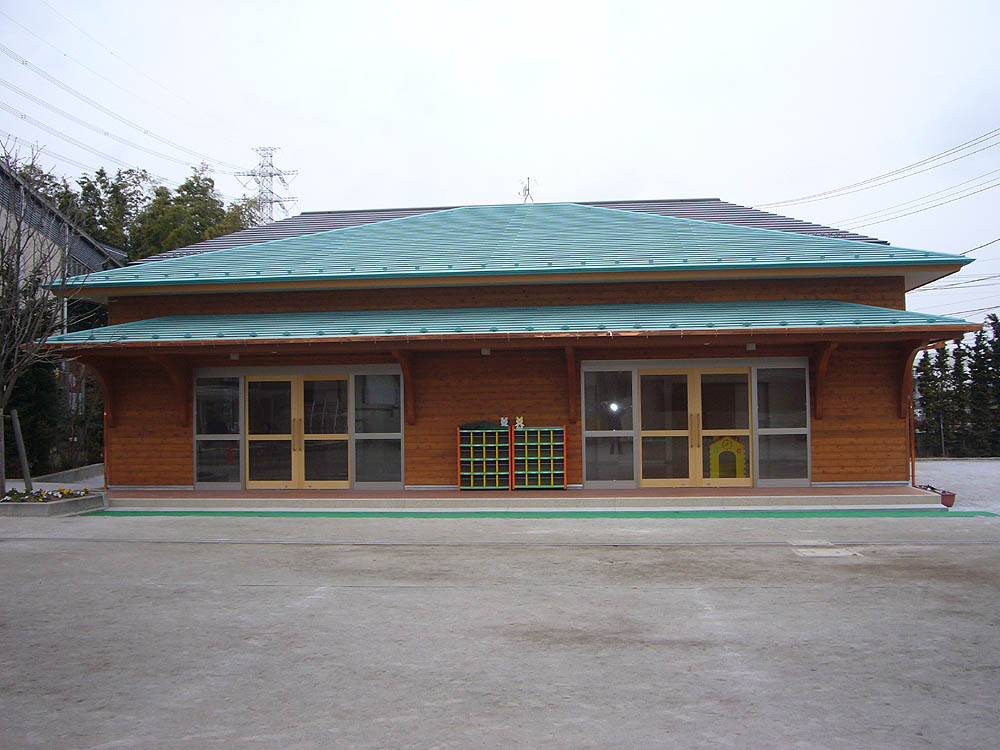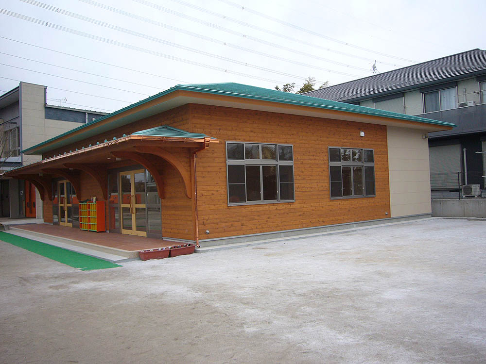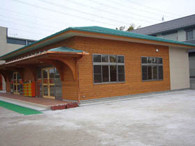 園舎の仕事は始めての体験で、勉強するところが多々ありましたが本造で外壁米杉材板貼、床も桜のフロアと暖かい感じのする園舎になりました。